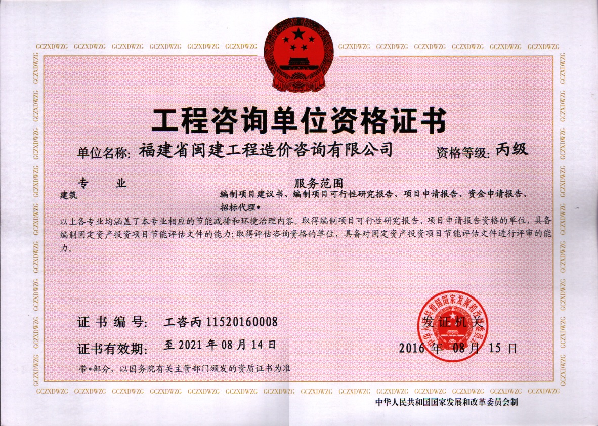 福建省閩建工程造價咨詢有限公司成立于1993年,原隸屬福建省建設(shè)委員會,2001年脫鉤改制為有限責(zé)任公司,公司注冊資本1200萬元,是一家具有甲級工程招標(biāo)代理資質(zhì)(證書編號:F135000429)、甲級工程造價咨詢資質(zhì)(證書編號:甲150135000084)、政府采購代理資質(zhì)、預(yù)備級中央投資項目招標(biāo)代理機構(gòu)資質(zhì)(證書編號:ZYTZ-C2013239)、丙級工程資質(zhì)(證書編號:工咨丙11520160008)的綜合性工程咨詢服務(wù)單位。能承擔(dān)各類建設(shè)項目的工程招標(biāo)代理、工程造價咨詢...